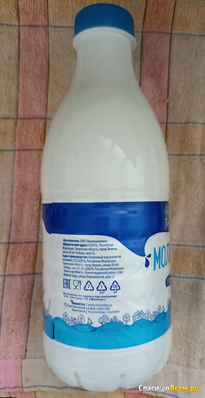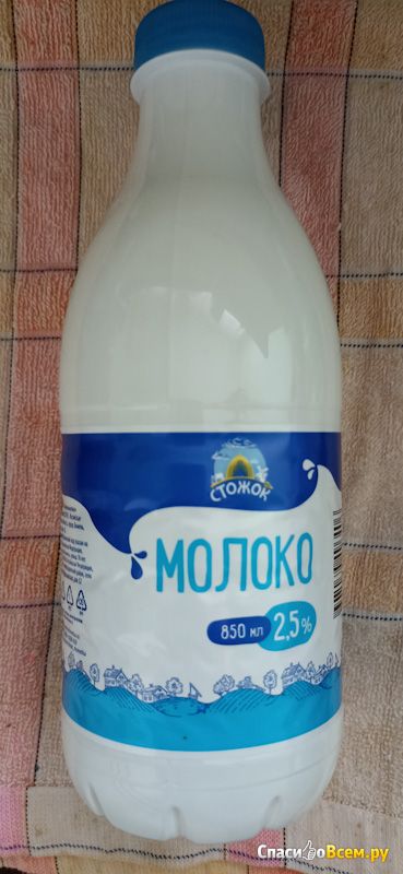Взор остановился на восемьсотпятидесятиграммовой пластиковой бутылке молока "Стожок". Оформлена в бело-синей расцветке.