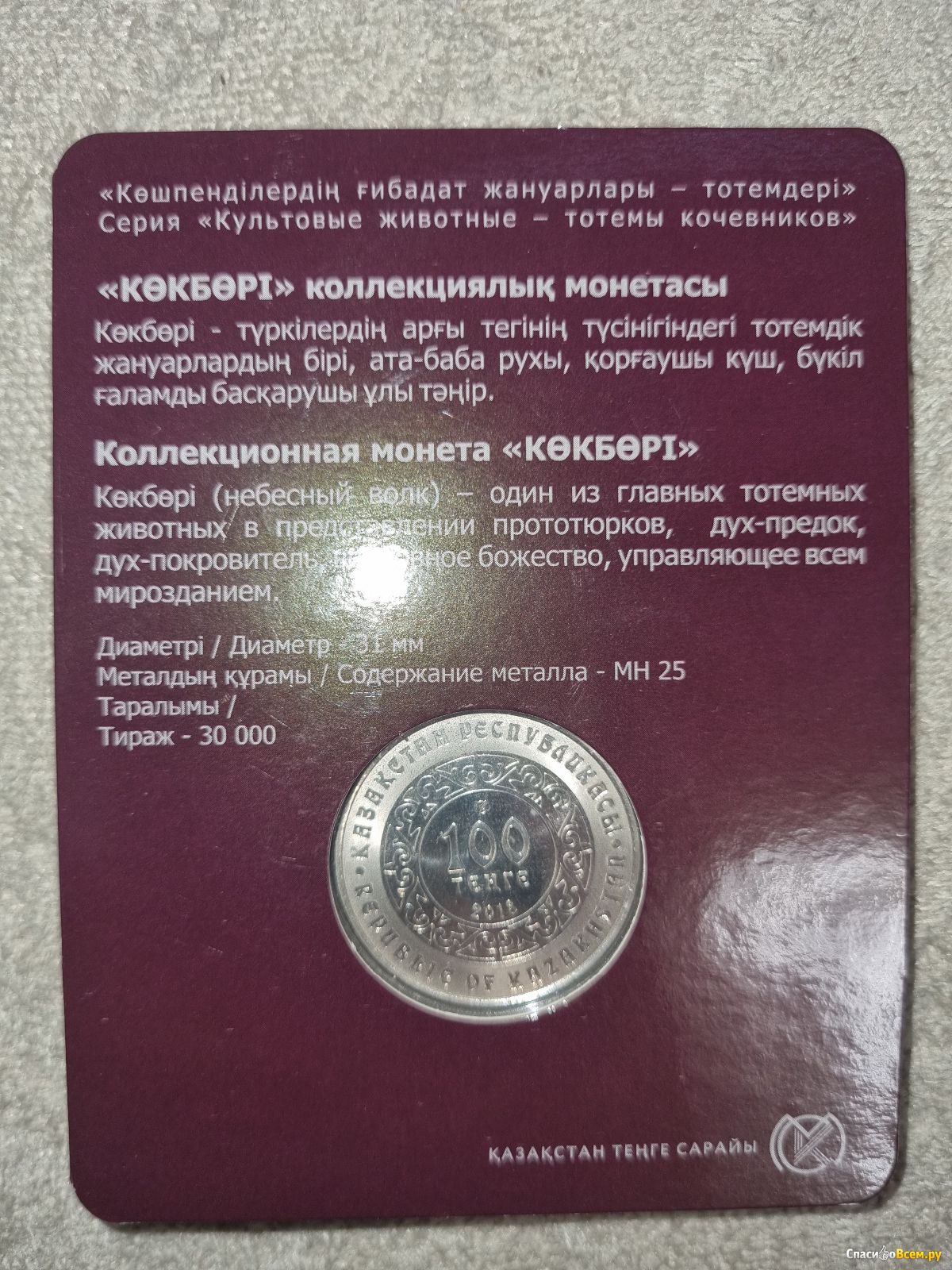 По казахски это звучит, как Кокбори. Монета номиналом 100 тенге. Курс тенге к рублю составляет 0,155 рубля. Т.е., монета соответствует 15,5 рублям. Но за такую цену монеты не купить. Такие монеты расходятся по коллекционерам, хотя, может, в обиходе Казахстана может посчастливиться встретить ее.
