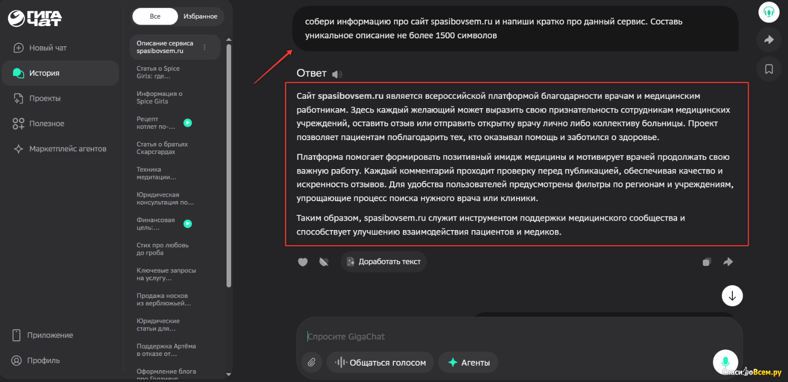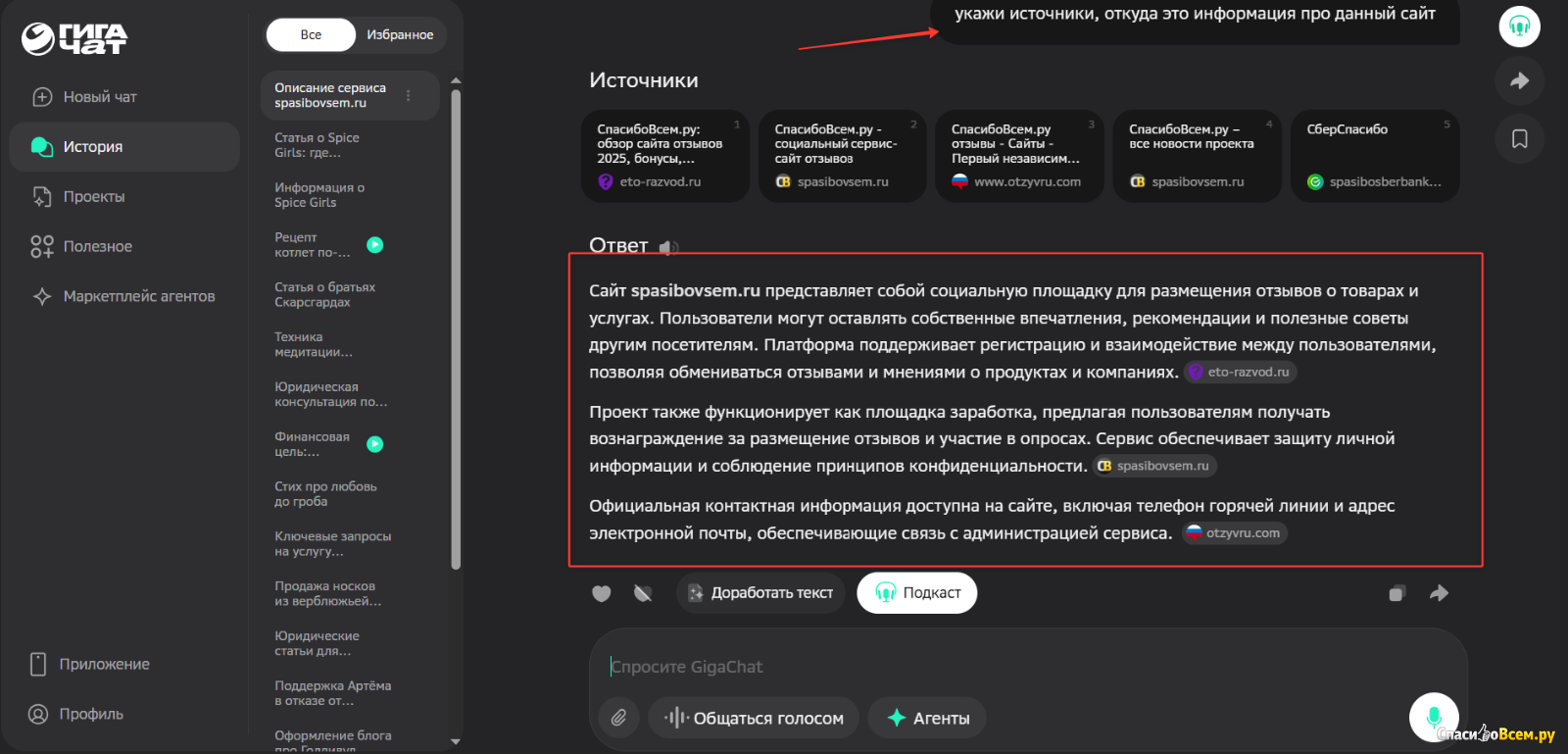Достоверность текстовой информации от ГигаЧата нужно проверять. Благо, нейросеть может собирать информацию в интернете и опираться на опубликованные статьи. Вот пример: пишу запрос в диалоговое окно, чтобы ГигаЧат напила про наш сайт СпасибоВсем. В первом варианте я получила недостоверную информацию, а после уточнения запроса сервис уже выдал корректный ответ на основе источников (смотри скрины).