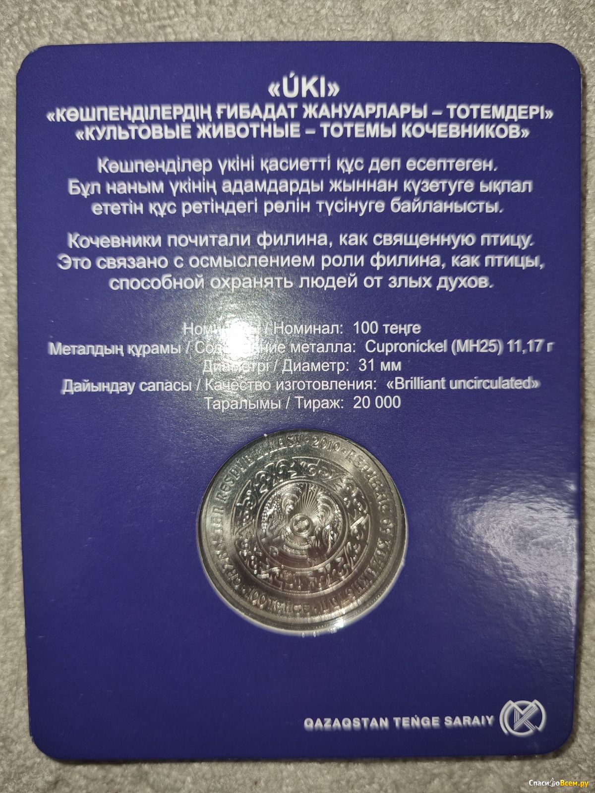 Серия "Культовые животные - тотемы кочевников" - самая красивая, на мой взгляд, серия монет. Первая, с волком, была отчеканена в 2018 г. А в 2019 году появилась монета Филин, Uki.